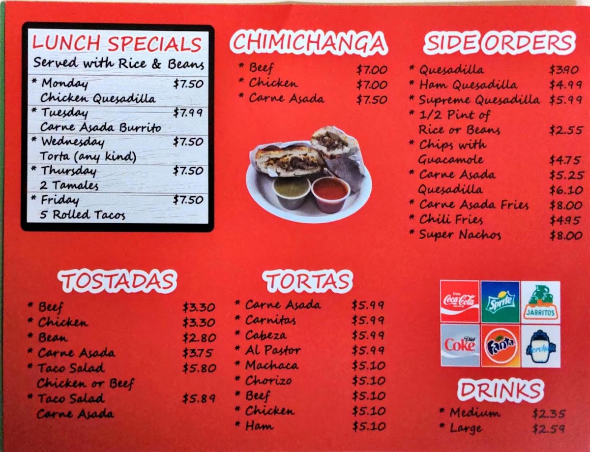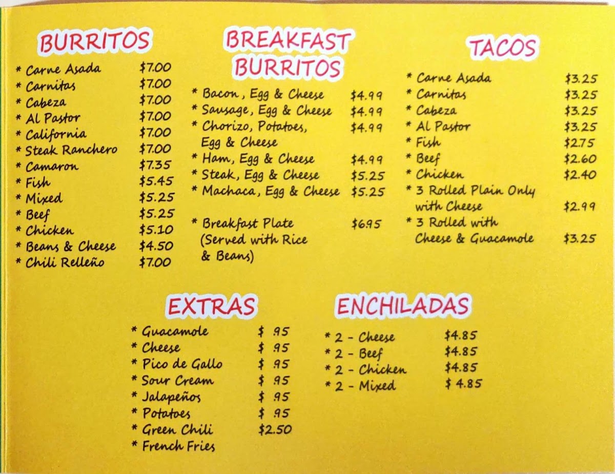 The menu is a treasure trove of delicious options, prominently featuring their mouthwatering burritos. Picture yourself sinking your teeth into a Carne Asada burrito filled with tender grilled steak, or perhaps you’ll opt for the flavorful Carnitas or zesty Al Pastor. Each burrito is a symphony of taste, generously packed with quality ingredients, all for just $7.00.